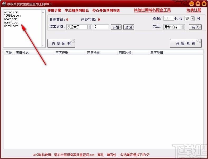 草根百度权重批量查询工具是一款非常专业且优秀的网站查询软件,提供强大的查询功能,可帮助用户对网站相关信息进行查询,包括百度权重、百度流量、百度收录和真实反链,如果您需要进行此类查询,就可以用到这款软件,支持批量查询,可查询多个不同的域名,您只需将这些域名添加至软件,设置相应的查询选项,一键即可开始查询,快速且准确的输出查询结果,可直接在软件界面查看百度权重、百度流量等,直观的进行了解,使用起来非常方便,欢迎有需要的用户下载体验